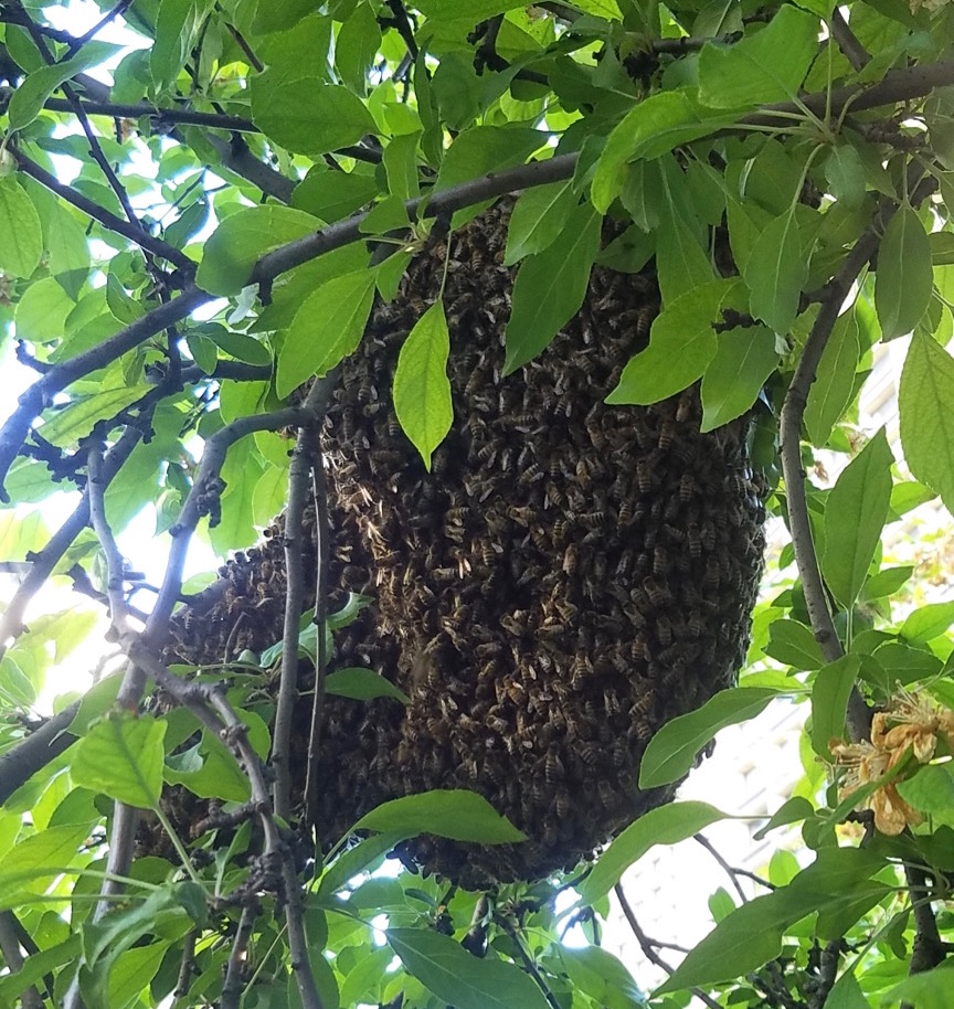 This was exciting and a little scary. What should we do? First, we asked our visitors to avoid the area and blocked it off. Bees in a swarm are not at all aggressive, but it was certainly better to be careful.