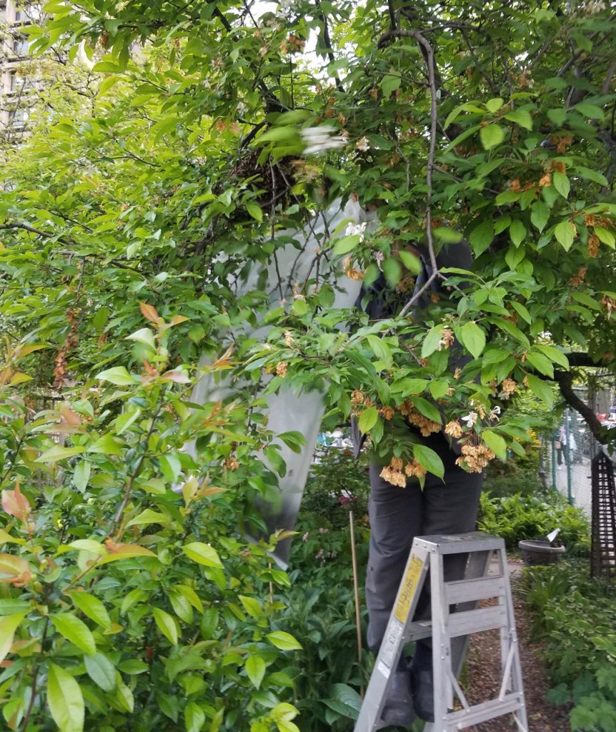 A phone call and 15 minutes later, Ray Sage came to the rescue. Ray has been keeping bees for the last 6 years on a rooftop in the East Village and is an experienced swarm capturer. He quickly assessed the situation. The swarm had chosen a low branch and was accessible by stepladder; good. Did we have a hive for them? We improvised one with two spare stackable boxes from our hive, a few empty honey frames and a piece of plywood for a bottom. But how could we get the bees into this contraption? Ray took a large plastic garbage bag and climbed onto the ladder. I helped him to hold the open bag under the swarm. Then, Ray shook the branch. Clumps of bees fell down. Another shake and most of them were “bagged”.