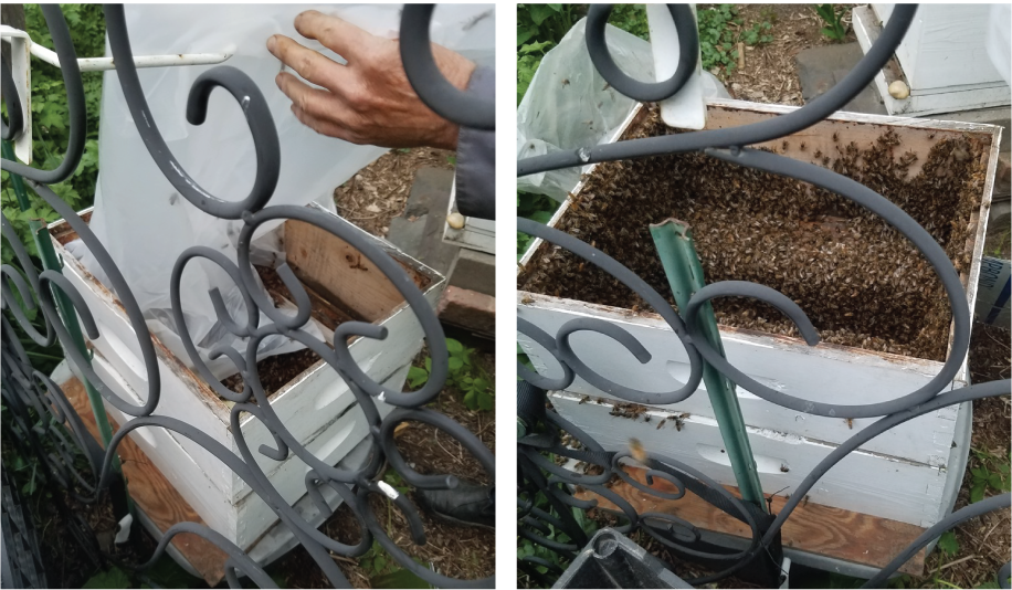 Ray brought the bag to our makeshift hive and poured the bees inside. He then quickly put an improvised lid on the box.