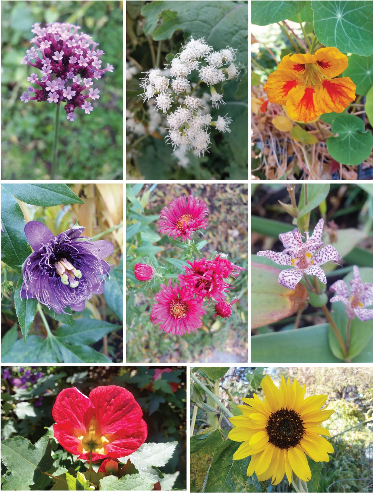 Here, seen from top left: Verbena bonariensis (a plant that self seeds happily and comes up where it likes it best), the native wild flower white snakeroot (Eupartorium rugosum), a last Nasturtium flower, toad lilies (Tricyrtis hirta), a late fall sunflower, Arbutilon, passion flower, and fall asters in the middle.