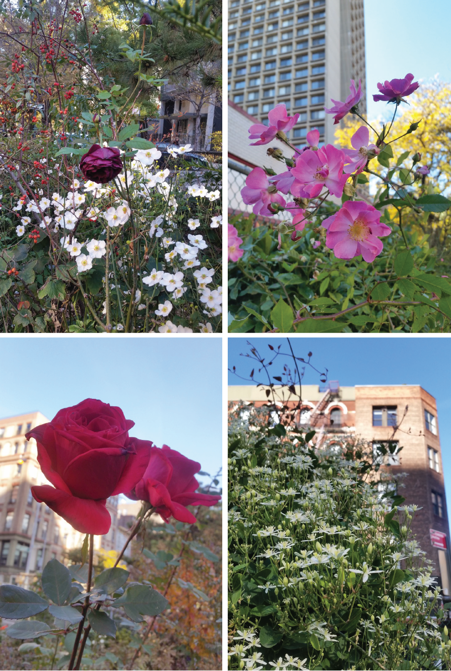 From top left: “The Prince” rose in the North Garden, “Simplicity” is one of the sturdiest roses in our garden, Clematis vitalba, and Charles Mallerin.