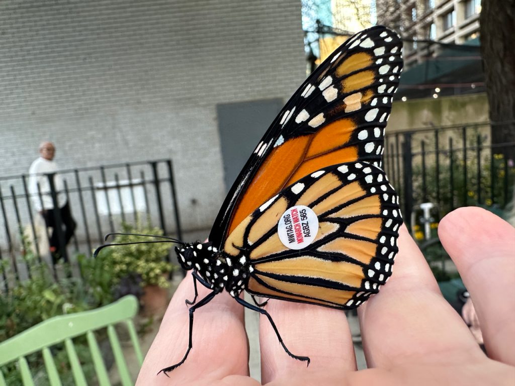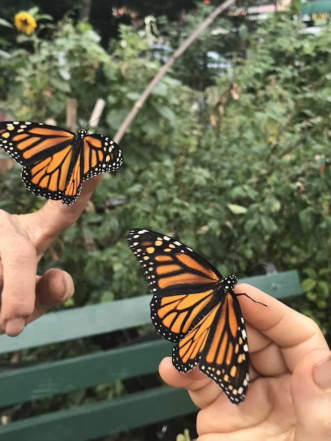 Of course, the scientists can’t tag so many butterflies all by themselves. They enlist regular people to help with this task. These citizen scientists are often school children and students, but also gardeners at LaGuardia Corner Garden! This year, we tagged about 70 male and female migrating monarchs. If we are very lucky, one of them will be found by another citizen scientists somewhere between here and Mexico. We would be more than thrilled.