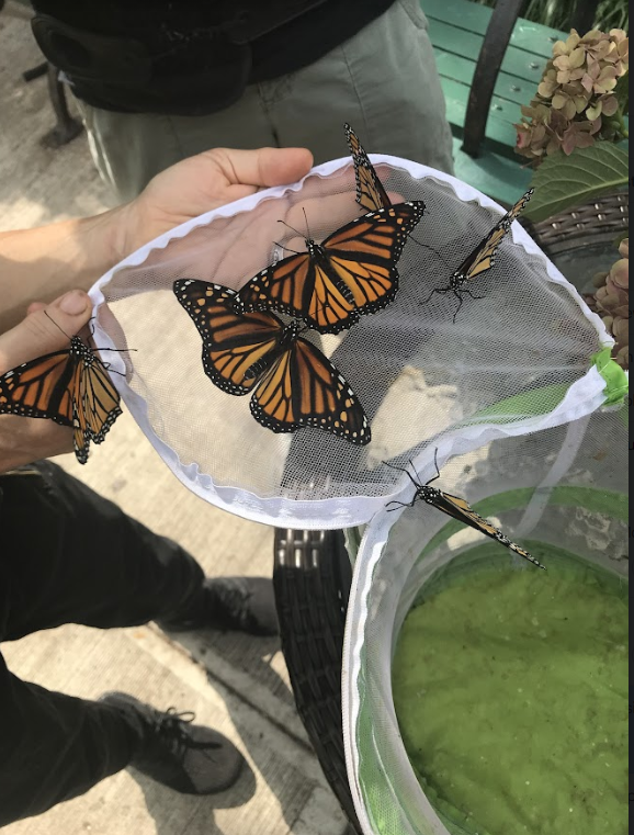 As in previous years, Johannes, our butterfly expert, collected eggs and small caterpillars of monarch butterflies to let them grow up in a safe environment (his apartment), free of predators and parasites. This is not an easy feat! Each little larva needs fresh milkweed to eat all the time; and as we all know, caterpillars are very very hungry. When they have grown up, they need just the right place to pupate. Finally, the adult butterflies needs a safe place to dry out their new wings before they can go out into the world. Considering all of this, it is amazing that Johannes could raise a stunning number of 159 monarchs this year!