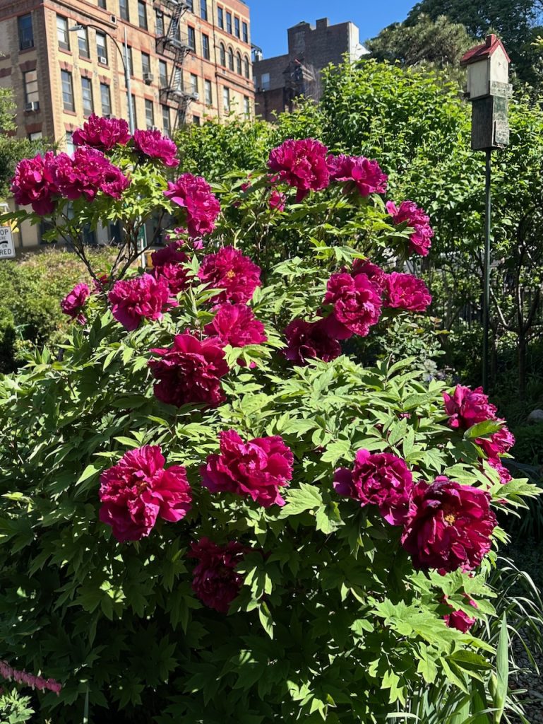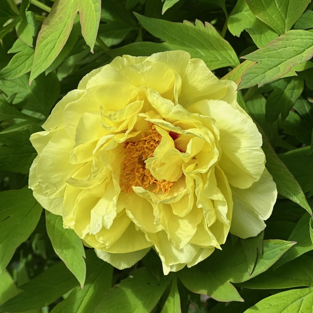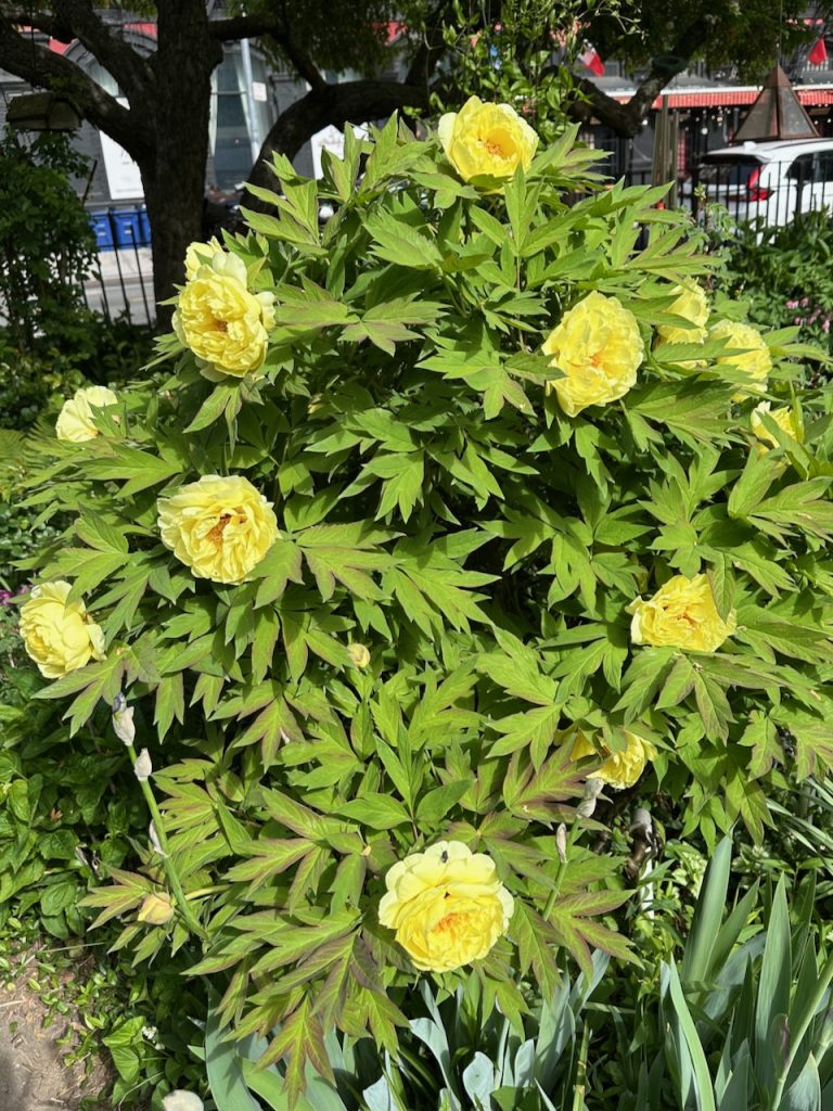 The yellow tree peony is always the last to open its flowers. It is an Itoh peony, a cross between a tree peony and a herbaceous peony. Only these have such bright yellow flowers.