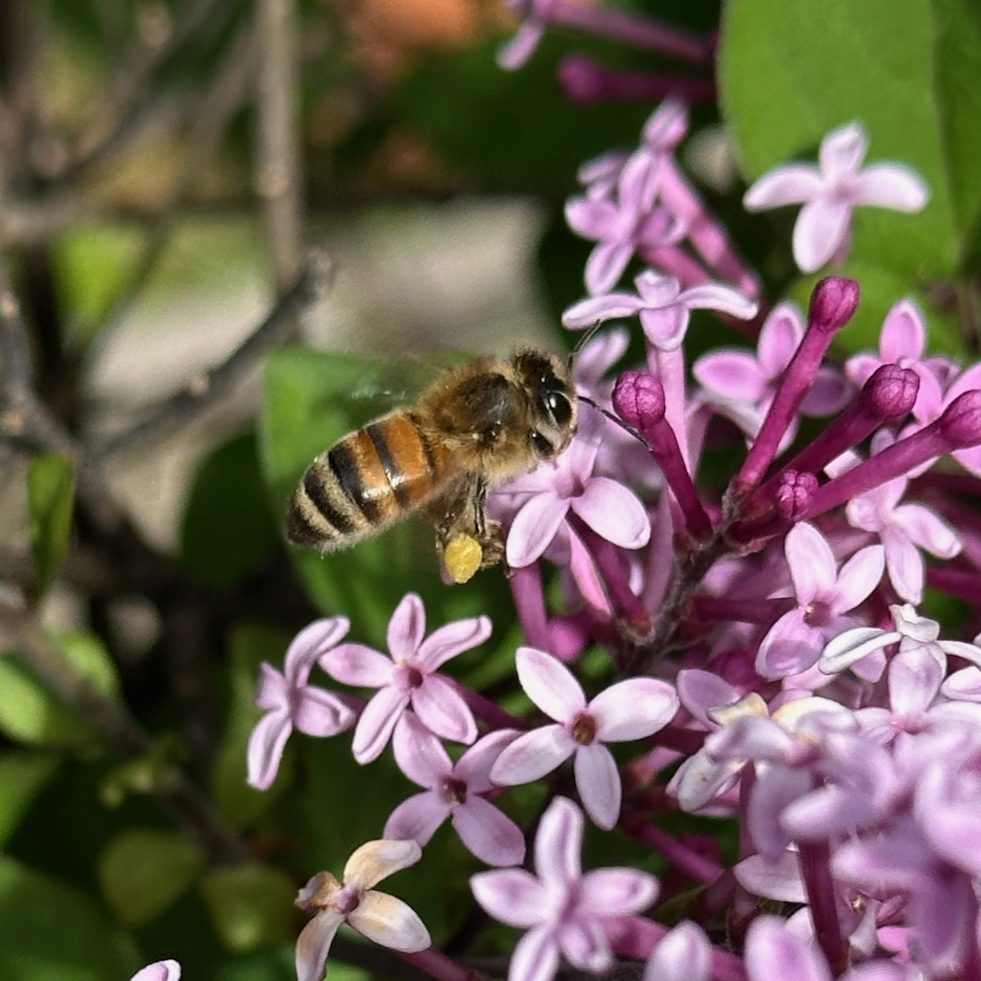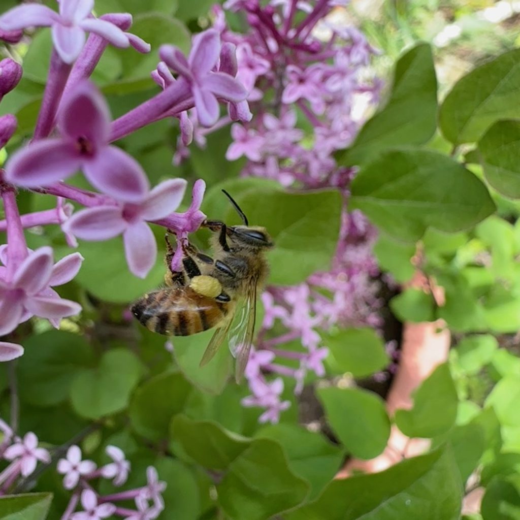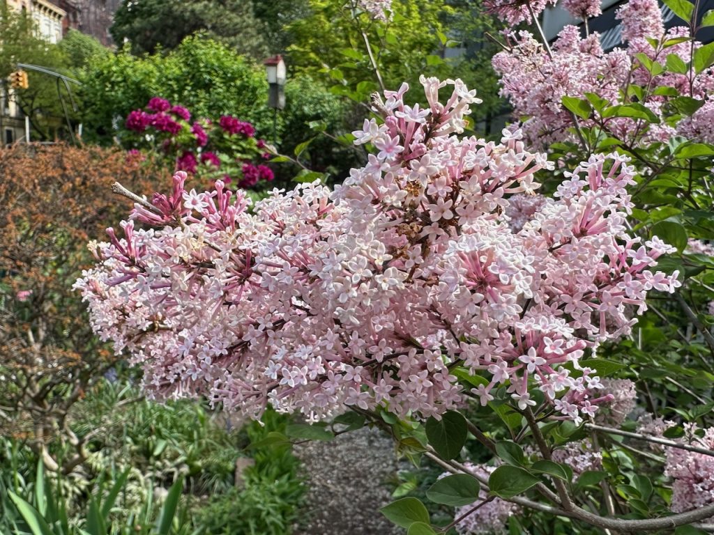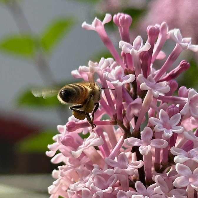 We love the Korean lilacs because they not only look lovely in spring and have a wonderful fragrance, but they also reliably re-bloom later in summer. And these flowers are attractive to pollinators, too (here honeybees).
